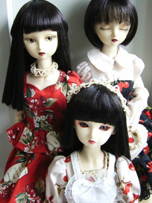 ここのところは小夜子(旧めぐ)・マノン(旧ミミ)・ルル(旧のの)だったのを、小夜子・小夜子零號(旧めぐデフォルトメイク)・みを(旧五番)と初期っ子揃い踏みにしてみました。去年「展示室」にアップした、ちょっとずつお揃いのチェリー柄の服で、髪は黒で揃えて、これはこれでいい感じ。